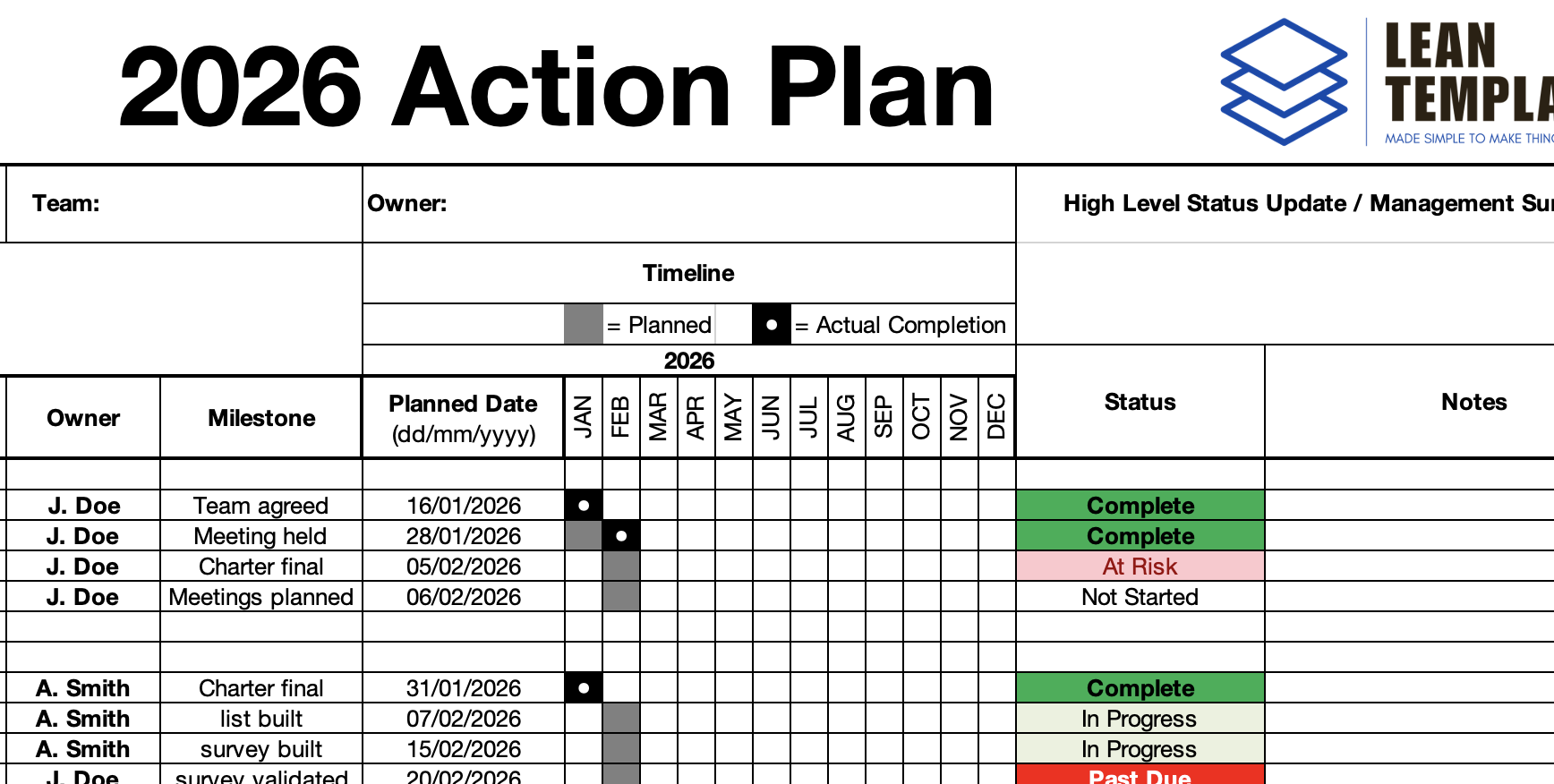 - Editable Excel template, with monthly layout, status indicators, ownership, and comment sections